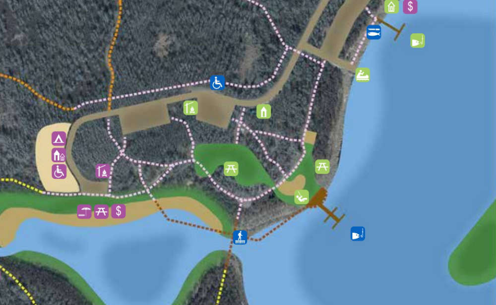 Option two would include a new fish cleaning station with running water, an additional fishing dock near playground area, four additional washroom buildings, small business opportunities, rentable glamping/campsite sites, a new swim pond with a sandy beach area, among others.