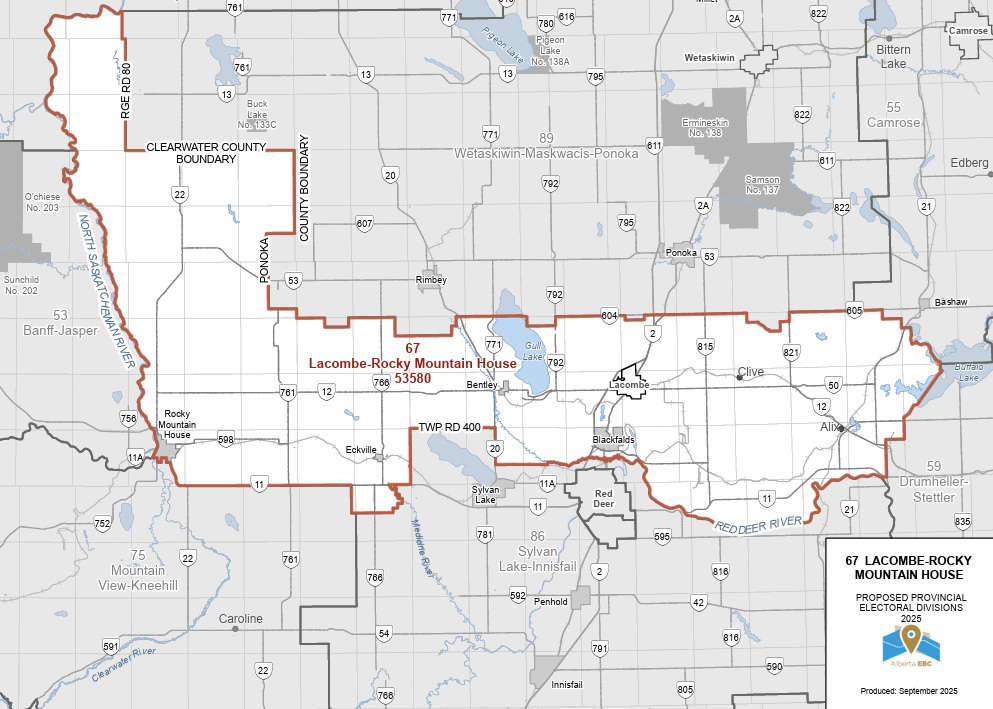 South of the Highway would be the new riding of ‘Lacombe-Rocky Mountain House’. This new constituency would encompass Lacombe, Bentley, Blackfalds, Clive, Alix, Eckville, and Rocky Mountain House, which would serve as the riding's western boundary between Mountainview-Kneehill and Banff-Jasper.